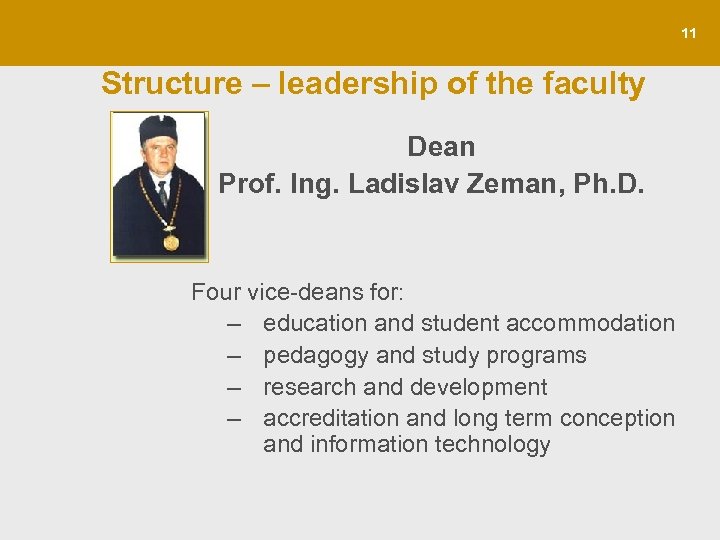 11 Structure – leadership of the faculty Dean Prof. Ing. Ladislav Zeman, Ph. D. Four vice-deans for: – education and student accommodation – pedagogy and study programs – research and development – accreditation and long term conception and information technology