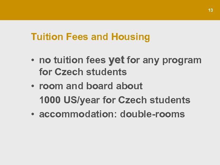 13 Tuition Fees and Housing • no tuition fees yet for any program for Czech students • room and board about 1000 US/year for Czech students • accommodation: double-rooms