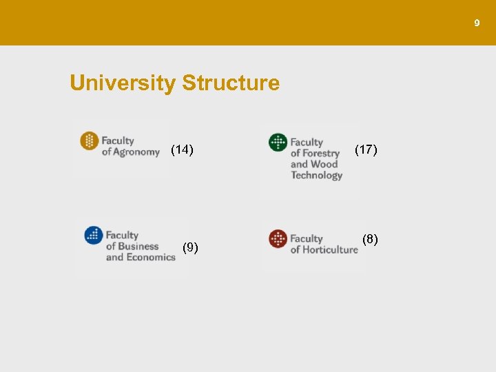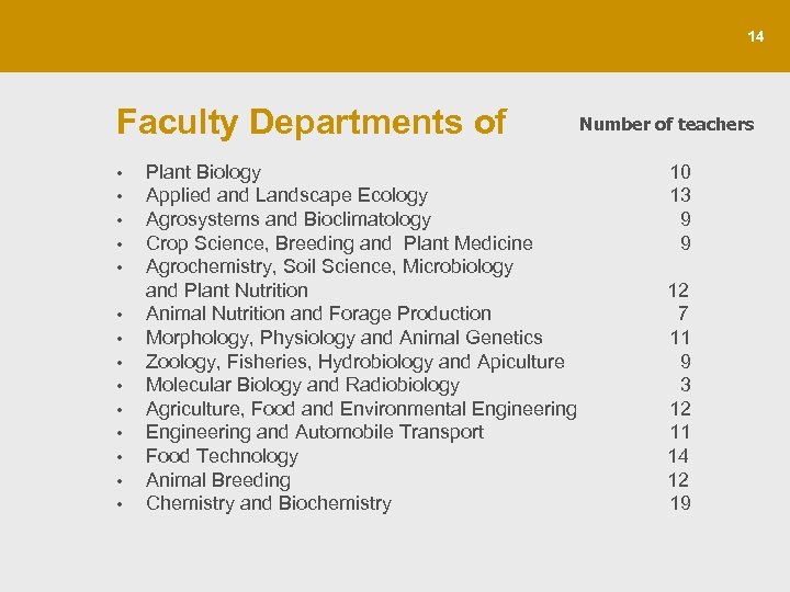 14 Faculty Departments of • • • • Plant Biology Applied and Landscape Ecology Agrosystems and Bioclimatology Crop Science, Breeding and Plant Medicine Agrochemistry, Soil Science, Microbiology and Plant Nutrition Animal Nutrition and Forage Production Morphology, Physiology and Animal Genetics Zoology, Fisheries, Hydrobiology and Apiculture Molecular Biology and Radiobiology Agriculture, Food and Environmental Engineering and Automobile Transport Food Technology Animal Breeding Chemistry and Biochemistry Number of teachers 10 13 9 9 12 7 11 9 3 12 11 14 12 19