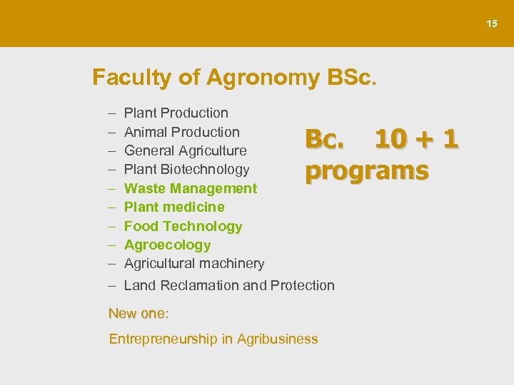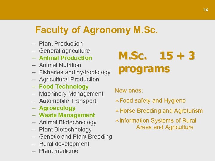 15 Faculty of Agronomy BSc. – – – – – Plant Production Animal Production General Agriculture Plant Biotechnology Waste Management Plant medicine Food Technology Agroecology Agricultural machinery Bc. 10 + 1 programs – Land Reclamation and Protection New one: Entrepreneurship in Agribusiness