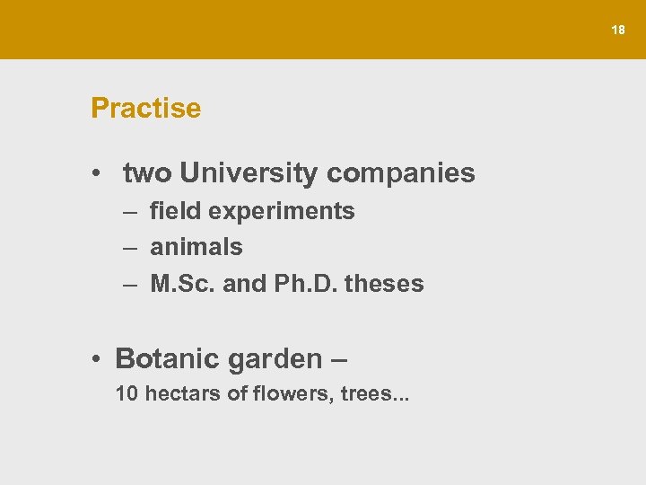 18 Practise • two University companies – field experiments – animals – M. Sc. and Ph. D. theses • Botanic garden – 10 hectars of flowers, trees. . .