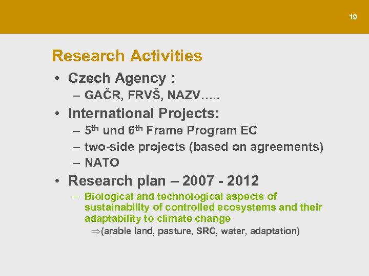 19 Research Activities • Czech Agency : – GAČR, FRVŠ, NAZV…. . • International Projects: – 5 th und 6 th Frame Program EC – two-side projects (based on agreements) – NATO • Research plan – 2007 - 2012 – Biological and technological aspects of sustainability of controlled ecosystems and their adaptability to climate change Þ(arable land, pasture, SRC, water, adaptation)