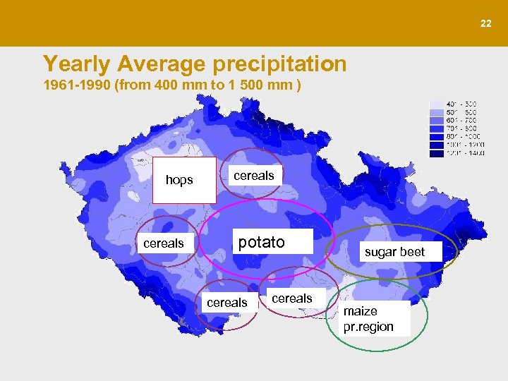 22 Yearly Average precipitation 1961 -1990 (from 400 mm to 1 500 mm ) hops cereals potato cereals sugar beet maize pr. region