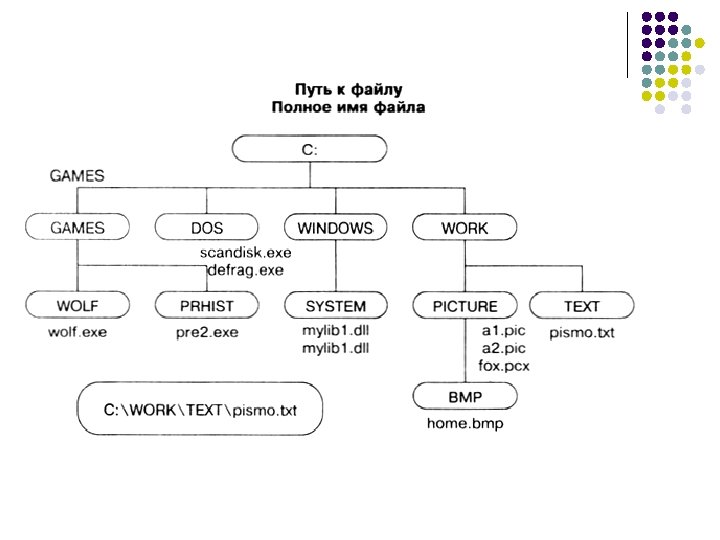 Над файлами могут производиться различные операции: l l Копирование (копия файла помещается из одного каталога в другой) Перемещение (сам файл перемещается в другой каталог) Удаление (запись о файле удаляется из каталога) Переименование (изменяется имя файла) и т. д.