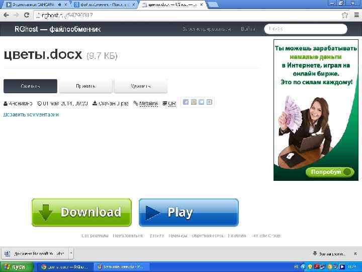 Показом реклами. Зазвичай файлообмінники вводять штучну паузу, коли користувачі запитують файл. Протягом деякого часу (зазвичай 45 -120 сек. ) Користувачеві показується реклама, і тільки потім віддається файл.