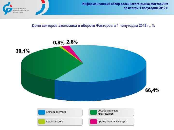 Рынок факторинга в 2011 году еще более четко сегментировался на факторинг как замену кредита (то есть с минимальной сервисной составляющей) и факторинг с полноценной сервисной составляющей. n Рост рынка пока обеспечивают преимущественно клиенты, которые видят в факторинге только источник пассивов, а не комплексную услугу, позволяющую экономить на расходах. В сегменте факторинга с минимальным сервисом сложилась жесткая конкуренция, поскольку большая часть Факторов ориентирована именно на него. n По мнению большинства Факторов, рост факторинговых ставок со второй половины 2011 года происходил медленнее, чем рост стоимости пассивов Факторов, поэтому маржинальность факторинга не выросла. Примечательно, что лидеры рынка не предоставили данные о размере факторингового вознаграждения, полученного ими в 2011 году, поэтому не представляется возможным привести динамику показателя. n В целом на рынке факторинга произошло снижение коэффициента резервирования (в результате роста портфелей, благодаря усилиям Факторов по урегулированию старых проблемных активов и за счет роста доли специализированных Факторов, которые обычно не создают резервы). n