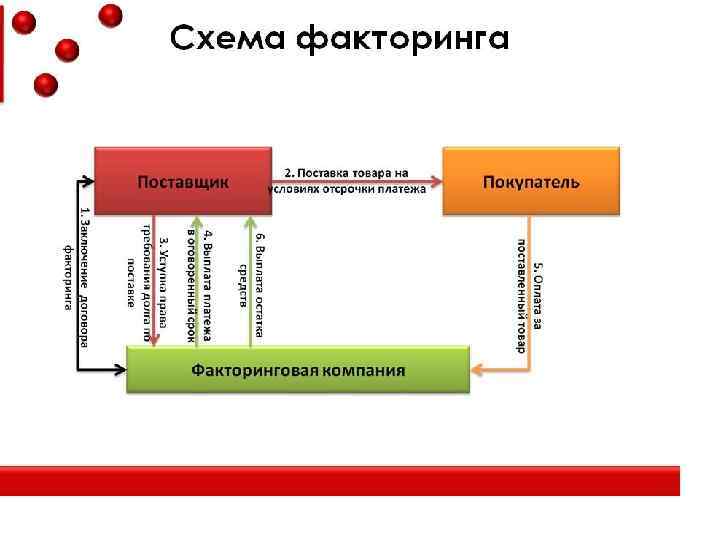 Схема в цифрах Предположим, что поставщик переуступает факторинговой компании денежные требования к своим клиентам на сумму 1000 рублей. n Согласно договору, факторинговая компания после предоставления документов, подтверждающих выполнение обязательств поставщика перед покупателями (поставка товаров или оказание услуг), пере- числяет поставщику первый платеж, например, в размере 80% от суммы переуступленных денежных требований, минус комиссия, к примеру, в размере 3%. Таким образом, поставщик получает 770 рублей (1000*0, 8 -1000*0, 03). Оставшуюся сумму (200 рублей) фактор перечисляет на счет поставщика после получения денег от покупателей. n