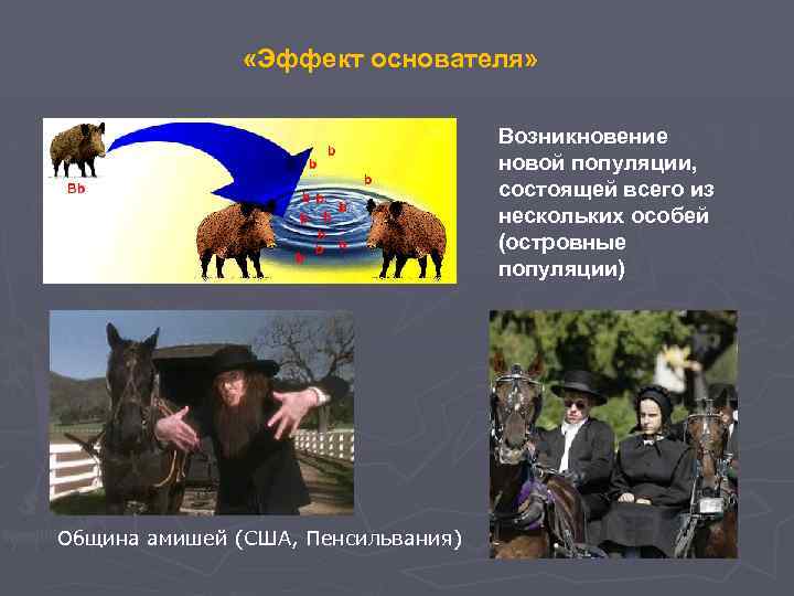 «Эффект основателя» Возникновение новой популяции, состоящей всего из нескольких особей (островные популяции) Община амишей (США, Пенсильвания)