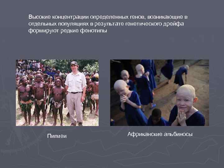 Высокие концентрации определенных генов, возникающие в отдельных популяциях в результате генетического дрейфа формируют редкие фенотипы Пигмеи Африканские альбиносы