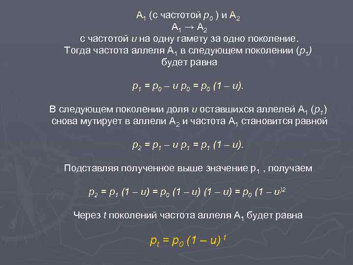 А 1 (с частотой р0 ) и А 2 А 1 → А 2 с частотой u на одну гамету за одно поколение. Тогда частота аллеля А 1 в следующем поколении (р1) будет равна p 1 = p 0 – u p 0 = p 0 (1 – u). В следующем поколении доля u оставшихся аллелей А 1 (р1) снова мутирует в аллели А 2 и частота А 1 становится равной p 2 = p 1 – u p 1 = p 1 (1 – u). Подставляя полученное выше значение р1 , получаем p 2 = p 1 (1 – u) = p 0 (1 – u)2. Через t поколений частота аллеля А 1 будет равна pt = p 0 (1 – u) t