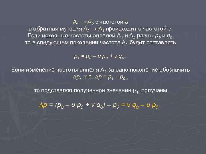 А 1 → А 2 с частотой u, а обратная мутация А 2 → А 1 происходит с частотой v. Если исходные частоты аллелей А 1 и А 2 равны p 0 и q 0, то в следующем поколении частота А 1 будет составлять p 1 = p 0 – u p 0 + v q 0. Если изменение частоты аллеля А 1 за одно поколение обозначить ∆p, т. е. ∆p = p 1 – p 0 , то подставляя полученное значение р1, получаем ∆p = (p 0 – u p 0 + v q 0) – p 0 = v q 0 – u p 0.
