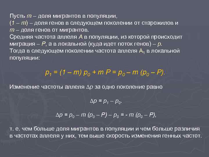 Пусть m – доля мигрантов в популяции, (1 – m) – доля генов в следующем поколении от старожилов и m – доля генов от мигрантов. Средняя частота аллеля А в популяции, из которой происходит миграция – Р, а в локальной (куда идет поток генов) – р. Тогда в следующем поколении частота аллеля А 1 в локальной популяции: p 1 = (1 – m) p 0 + m P = p 0 – m (p 0 – P). Изменение частоты аллеля ∆р за одно поколение равно ∆р = р1 – р0. ∆р = p 0 – m (p 0 – P) – p 0 = - m (p 0 – P), т. е. чем больше доля мигрантов в популяции и чем больше различия в частотах аллеля у них, тем выше скорость изменения генных частот.