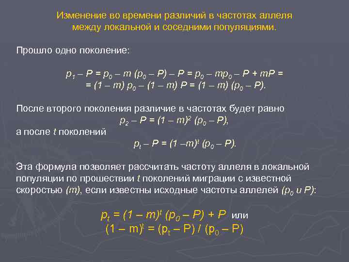 Изменение во времени различий в частотах аллеля между локальной и соседними популяциями. Прошло одно поколение: p 1 – P = p 0 – m (p 0 – P) – P = p 0 – mp 0 – P + m. P = = (1 – m) p 0 – (1 – m) P = (1 – m) (p 0 – P). После второго поколения различие в частотах будет равно p 2 – P = (1 – m)2 (p 0 – P), а после t поколений pt – P = (1 –m)t (p 0 – P). Эта формула позволяет рассчитать частоту аллеля в локальной популяции по прошествии t поколений миграции с известной скоростью (m), если известны исходные частоты аллелей (р0 и Р): pt = (1 – m)t (p 0 – P) + P или (1 – m)t = (pt – P) / (p 0 – P)