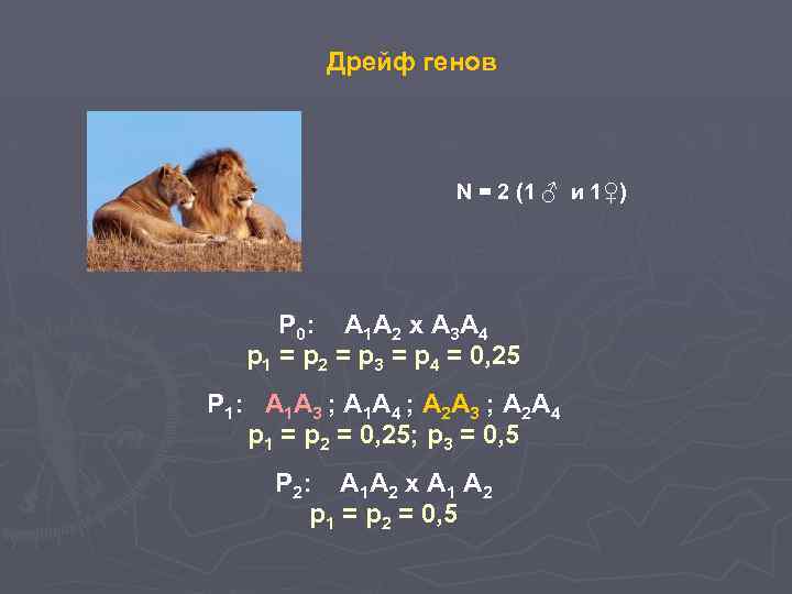 Дрейф генов N = 2 (1 ♂ и 1♀) Р 0: А 1 А 2 х А 3 А 4 р1 = р2 = р3 = р4 = 0, 25 P 1: A 1 А 3 ; А 1 А 4 ; А 2 А 3 ; А 2 А 4 р1 = р2 = 0, 25; р3 = 0, 5 Р 2: А 1 А 2 х А 1 А 2 р1 = р2 = 0, 5