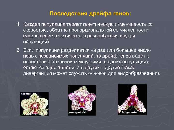 Последствия дрейфа генов: 1. Каждая популяция теряет генетическую изменчивость со скоростью, обратно пропорциональной ее численности (уменьшение генетического разнообразия внутри популяций). 2. Если популяция разделяется на две или большее число новых независимых популяций, то дрейф генов ведет к нарастанию различий между ними: в одних популяциях остаются одни аллели, а в других – другие (такая дивергенция может служить основой для видообразования).
