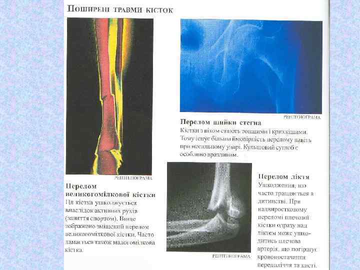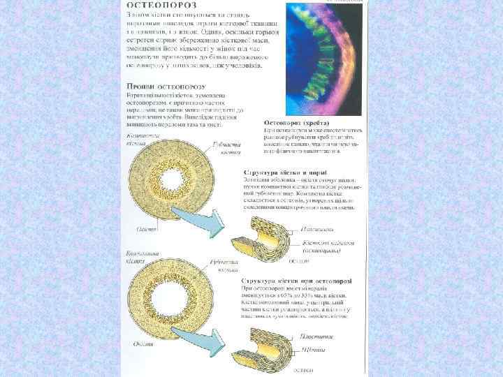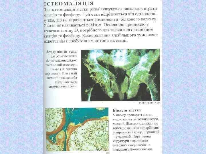 Факторы, влияющие на состояние костей ВИТАМИНЫ Действие Изменения при недостатке или избытке витамина Витамин С вит. С необходим для созревания коллагеновых волокон а) Резкая форма авитаминоза С цинга. б) Поражаются все виды соединительной ткани Витамин D Вит. D увеличивает всасывание Са в желудочно-кишечном тракте и отложение солей Са в костях. а) Резкая форма авитаминоза D рахит. б) Из-за недостаточной кальцификации костей, происходит их размягчение и искривление. Витамин А Вит А оказывает разные действия, в т. ч. усиливает функцию При гипервитаминозе А наблюдается деструкция (разрушение) костей. стеокластов.