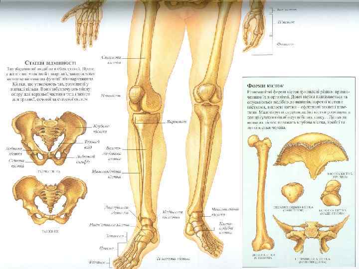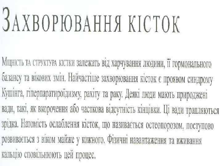Факторы, влияющие на состояние костей ГОРМОНЫ Действие Изменения при избытке или недостатке гормона Паратгормон (паратирин) повышает содержание Са в (гормон паращитовидных крови, усиливая, в частности, его вымывание желёз) из костей. При избытке паратгормона развивается фиброзный остит: резорбция (рассасывание) кости и образование на её месте фиброзной ткани. Паратгормон Кальцитонин (гормон щитовидной железы) Половые гормоны Напротив, кальцитонин Соответственно, при избытке снижает концентрацию Са в кальцитонина наблюдается крови, усиливая его избыточная кальцификация костей. поступление в кости. Половые гормоны стимулируют окостенение метаэпифизарной пластинки. а) При раннем половом созревании имеет место преждевременная остановка роста костей. б) А при позднем половом созревании руки и ноги становятся непропорционально длинными.