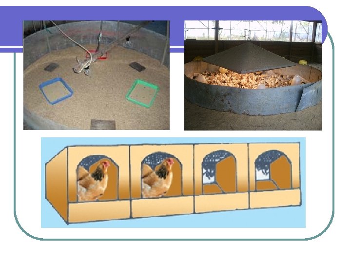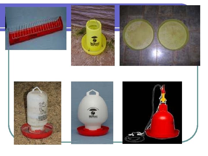 PERALATAN KANDANG A. Induk Buatan (brooder) - Pemanas; sumber listrik, minyak tanah (semawar) gas (gasolec), batu bara - Pembatas berbentuk lingkaran (chicken guard); bahan kayu, seng atau kardus B. Tempat Makan - Feeder tray - Bulat (round) round feeder atau hanging feeder, kapasitas 1, 3, 5, 7, 10 kg konvensional atau otomatis - Memanjang (trought) peternakan tradisional C. Tempat Minum - Bulat round waterer/drinker bell kapasitas 600 ml, 1 liter, 1 -2 galon konvensional atau otomatis - Cup, nipple dan kombinasinya D. Sarang (Nest) - Tipe petelur terbuat dari kayu atau logam - 1 sarang untuk 5 ekor ayam, dengan ukuran 30 x 45 x 50/60 cm (
