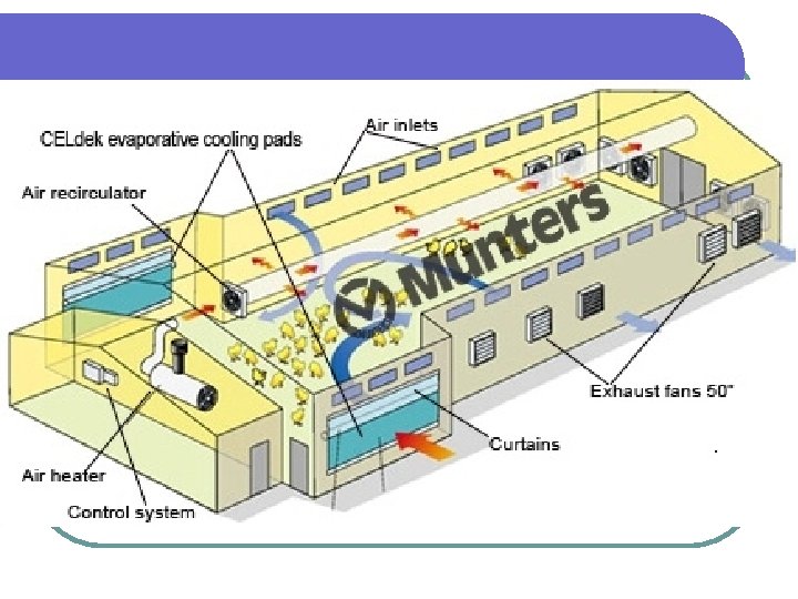 c. Temperatur Kandang • Temperatur untuk kandang anak ayam min 30 0 C • Temperatur yang optimal untuk kandang ayam produksi berkisar antara 20– 25 0 C • Temperatur konsumsi makan minum , kualitas kulit telur dan produksi telur d. Kelembaban Kandang • Kelembaban kandang yang baik antara 50 - 60 % • Kelembaban litter yang baik tidak lebih dari 25 % • Temperatur kelembaban konsumsi
