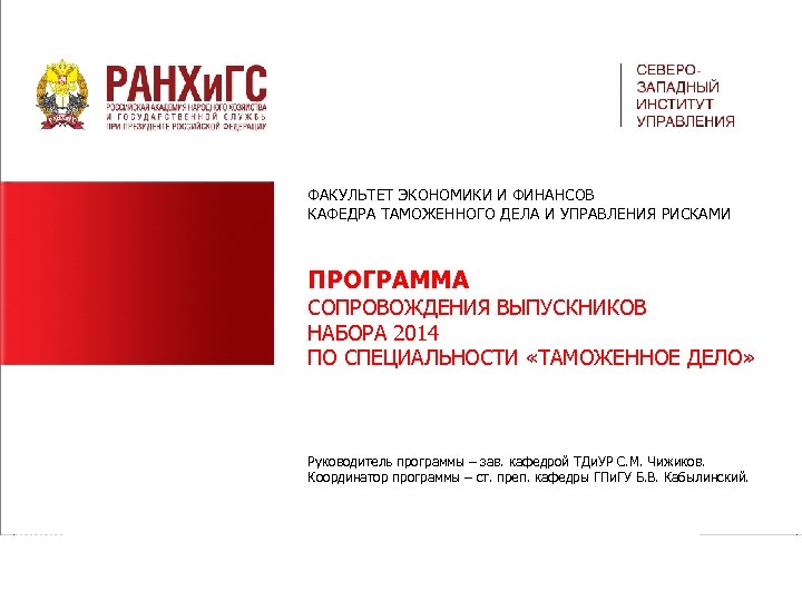 ФАКУЛЬТЕТ ЭКОНОМИКИ И ФИНАНСОВ КАФЕДРА ТАМОЖЕННОГО ДЕЛА И УПРАВЛЕНИЯ РИСКАМИ ПРОГРАММА СОПРОВОЖДЕНИЯ ВЫПУСКНИКОВ НАБОРА 2014 ПО СПЕЦИАЛЬНОСТИ «ТАМОЖЕННОЕ ДЕЛО» Руководитель программы – зав. кафедрой ТДи. УР С. М. Чижиков. Координатор программы – ст. преп. кафедры ГПи. ГУ Б. В. Кабылинский.