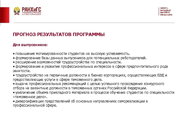 ПРОГНОЗ РЕЗУЛЬТАТОВ ПРОГРАММЫ Для кафедры и СЗИУ: • усиление лидирующих позиций Института на рынке образовательных услуг. • повышение качества обучения по специальности «таможенное дело» . • налаживание партнерских отношений с представителями малого, среднего и крупного бизнеса. • развитие диалога с участниками ВЭД и формирование в ближайшем будущем оптимальных условий для трудоустройства выпускников в крупных международных компаниях. • создание системы обратной связи между студентами, Институтом и работодателями. • совершенствование корпоративной культуры Института.