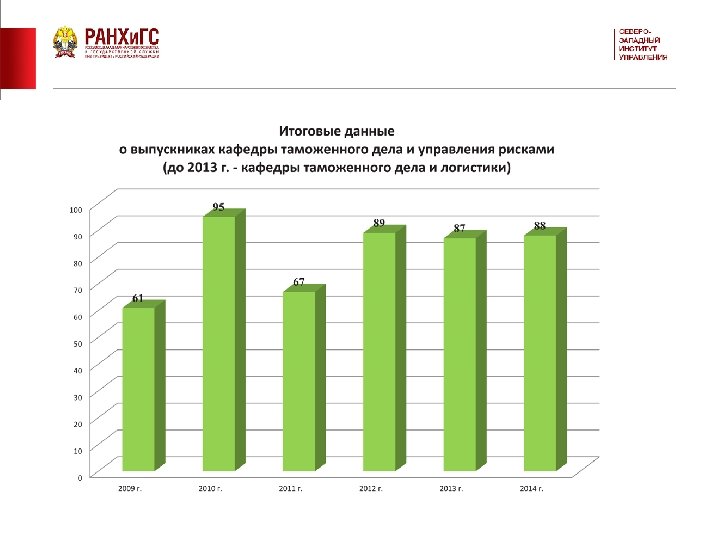 ОРГАНИЗАТОР ПРОГРАММЫ Кафедра таможенного дела и управления рисками СЗИУ РАНХи. ГС Статус: выпускающая кафедра по специальности «таможенное дело» . Входит с 2005 года в состав факультета экономики и финансов СЗИУ. Специализация: подготовка студентов, нацеленных на присвоение квалификации «Специалист таможенного дела» . Показатели: в течение 2008 -2014 годов дипломы о высшем образовании получили 487 выпускников. В настоящее время обучение проходит 384 человека.