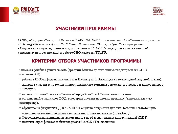 УЧАСТНИКИ ПРОГРАММЫ • Студенты, принятые для обучения в СЗИУ РАНХи. ГС по специальности «таможенное дело» в 2014 году (84 человека) в соответствии с условиями отбора для участия в программе. • Отдельные студенты, принятые для обучения в 2010 -2013 годах, при наличии высокой успеваемости и достижений в работе СНО кафедры ТДи. УР. КРИТЕРИИ ОТБОРА УЧАСТНИКОВ ПРОГРАММЫ • высокая учебная успеваемость (средний балл по дисциплинам, входящим в ФГОС+3 – не ниже 4. 0). • работа в СНО кафедры, факультета и Института (публикация не менее одной научной статьи). • активное участие в проектах и мероприятиях по тематике таможенного дела, организованных в Институте. • наличие положительных отзывов от представителей таможенных органов и организаций-участников ВЭД, в которых студент проходил практику (дополнительную стажировку). • обучение на факультете ДПО «ВШГУ» с целью получения дополнительных компетенций. • успешное освоение программ изучения иностранных языков (по выбору) в Образовательном лингвистическом центре профессиональных коммуникаций СЗИУ • наличие сертификатов и благодарностей от СК «Таможенник»