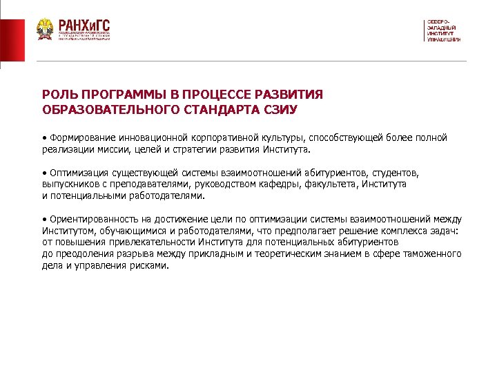 РОЛЬ ПРОГРАММЫ В ПРОЦЕССЕ РАЗВИТИЯ ОБРАЗОВАТЕЛЬНОГО СТАНДАРТА СЗИУ • Формирование инновационной корпоративной культуры, способствующей более полной реализации миссии, целей и стратегии развития Института. • Оптимизация существующей системы взаимоотношений абитуриентов, студентов, выпускников с преподавателями, руководством кафедры, факультета, Института и потенциальными работодателями. • Ориентированность на достижение цели по оптимизации системы взаимоотношений между Институтом, обучающимися и работодателями, что предполагает решение комплекса задач: от повышения привлекательности Института для потенциальных абитуриентов до преодоления разрыва между прикладным и теоретическим знанием в сфере таможенного дела и управления рисками.