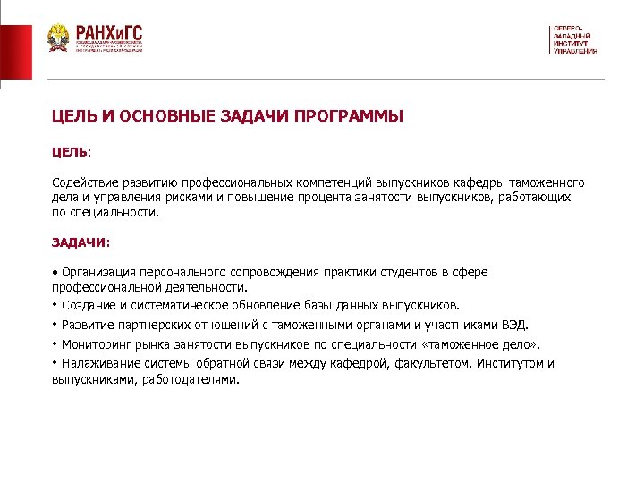 ЦЕЛЬ И ОСНОВНЫЕ ЗАДАЧИ ПРОГРАММЫ ЦЕЛЬ: Содействие развитию профессиональных компетенций выпускников кафедры таможенного дела и управления рисками и повышение процента занятости выпускников, работающих по специальности. ЗАДАЧИ: • Организация персонального сопровождения практики студентов в сфере профессиональной деятельности. • Создание и систематическое обновление базы данных выпускников. • Развитие партнерских отношений с таможенными органами и участниками ВЭД. • Мониторинг рынка занятости выпускников по специальности «таможенное дело» . • Налаживание системы обратной связи между кафедрой, факультетом, Институтом и выпускниками, работодателями.