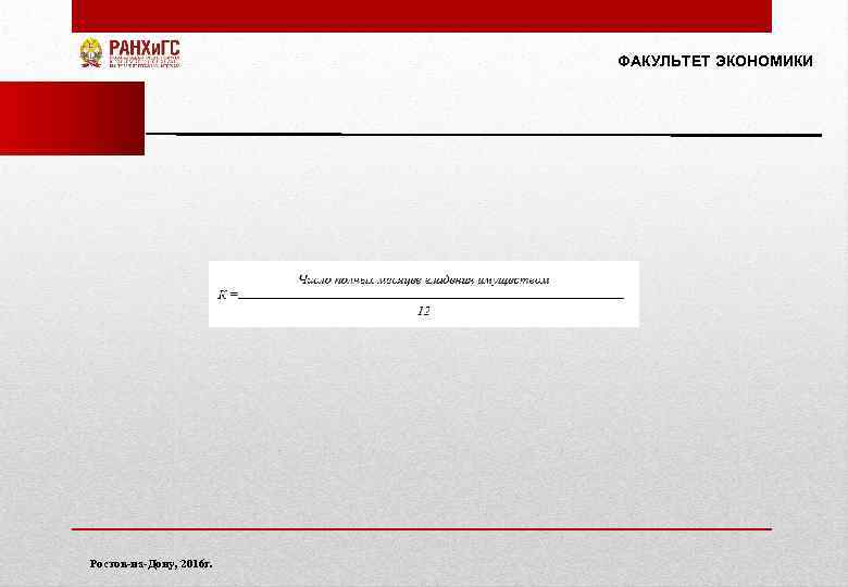 ФАКУЛЬТЕТ ЭКОНОМИКИ 3) НИФЛ (жилой дом) = КСобщ. пл – КС 50 кв. м. × Нст × К 4) НИФЛ (ЕНК) = КСобщ. пл – 1 млн р. × Нст × К, где НИФЛ – налог на имущество физических лиц; КС – кадастровая стоимость; КСобщ. пл – кадастровая стоимость общей площади объекта налогообложения; Нст – налоговая ставка; ЕНК – единый недвижимый комплекс; К – коэффициент владения объектом налогообложения в течении налогового периода, рассчитываемый как: Ростов-на-Дону, 2016 г.