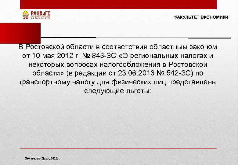 ФАКУЛЬТЕТ ЭКОНОМИКИ В Ростовской области в соответствии областным законом от 10 мая 2012 г. № 843 -ЗС «О региональных налогах и некоторых вопросах налогообложения в Ростовской области» (в редакции от 23. 06. 2016 № 542 -ЗС) по транспортному налогу для физических лиц представлены следующие льготы: Ростов-на-Дону, 2016 г.