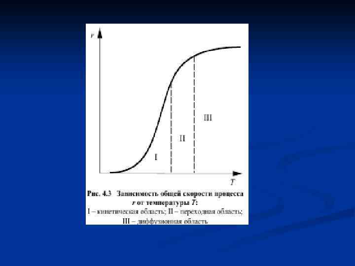 Гетерогенные процессы протекают на поверхности раздела фаз. Скорость всего процесса определяется скоростью самой медленной стадии, которая называется лимитирующей стадией. Для установления лимитирующей стадии процесса существует несколько приемов. Рассмотрим способ определения лимитирующей стадии опытным путем: • Температура оказывает сильное влияние на скорость химических реакций. • Так, если опыт показывает, что повышение температуры оказывает сильное влияние на скорость процесса, то процесс протекает в кинетической области (рис. 4. 3, область I). • Если при дальнейшем повышении температуры ее влияние на скорость общего процесса уменьшается, значит процесс перешел в переходную область (рис. 4. 3, область II). Если же далее при повышении температуры общая скорость процесса практически не изменяется, значит процесс протекает в диффузионной области (рис. 4. 3, область III).