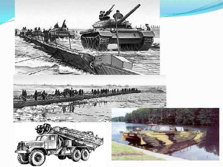 Переправа танків під водою v Забезпечує раптовість переправи танків на широкому фронті. v Застосовується при твердих ґрунтах річки і берегів. v Глибина ріки повинна бути не більше 5 м.