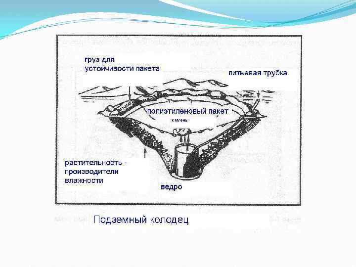 Характеристика засобів добування води Показник МКТ-2 М МКШ-15 УДВ-25 ПБУ-50 М Глибина буріння, м 7 15 15 25 50 3 -4 1 1, 5 -2, 5 0, 5 -0, 75 1 -2 1 3 1, 5 4 -6 2 -3 Можливий дебет (продуктивність) м 3/год 1 1, 5 2 2 3, 5; 4, 5 для ПБУ-50 М Розрахунок для розгортання, люд 3 -4 2 2 3 4 Час, год. На устаткування На звертання