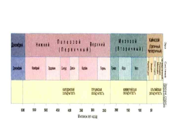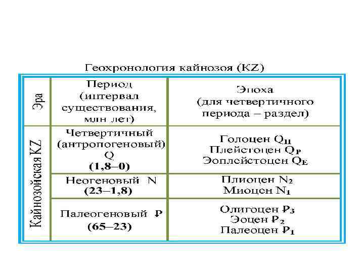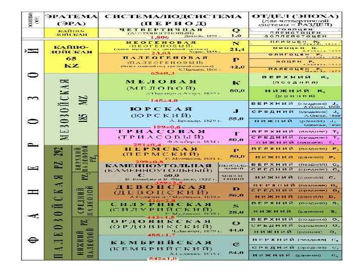 Фанерозойский эон подразделяется на три геологических эры (от более древних к молодым): • Палеозой • Мезозой • Кайнозой К фанерозою также иногда относят вендский период протерозоя