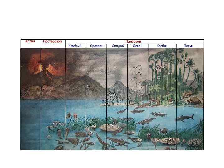 Палеозой. Растительный мир. Палеозой — эра древней жизни, продолжительность которой от 570 до 230 млн. лет. Подразделяется на шесть периодов: кембрий, ордовик, силурий, девон, карбон, пермь. Растения кембрия и ордовика населяют моря, представлены всеми отделами водорослей. В силурийском периоде (440 млн. лет назад) в зоне приливов и отливов от зеленых растений появляются первые наземные высшие растения — псилофиты (голые растения).