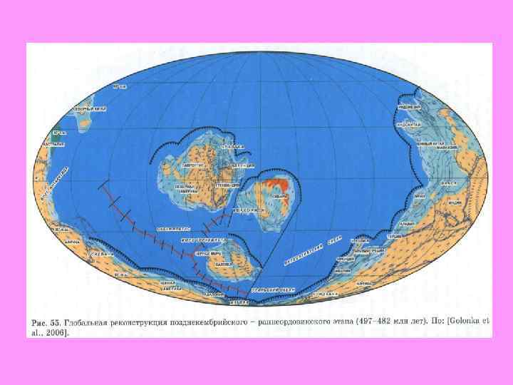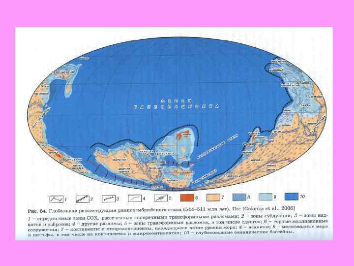 3. Палеогеография (суша, море, палеотектоника, складчатые пояса) После завершения байкальской складчатости на рубеже позднего протерозоя и венда, многие районы оказались приподнятами и стали областями сноса. Продукты разрушения байкалид накапливались в прогибах. В раннем кембрии началась крупная трансгрессия. Она особенно проявилась на Сибирской, Восточно Европейской и Северо Американской платформах. Гондвана представляла огромный континент. Водные массы из окружающих ее океанов проникали лишь на окраины континентов. После крупной раннекембрийской трансгрессии в начале среднего и середине верхнего кембрия наблюдались регрессии.