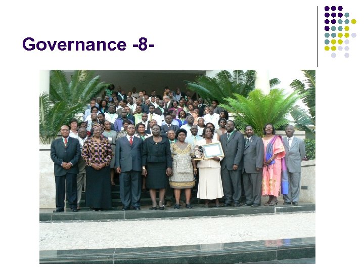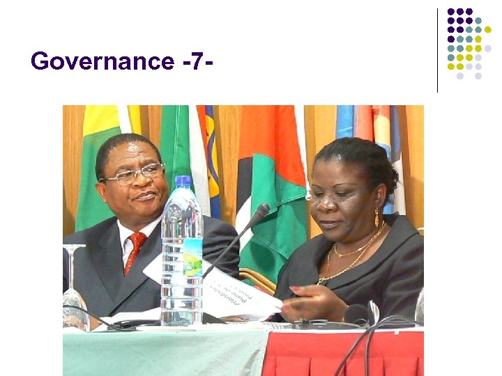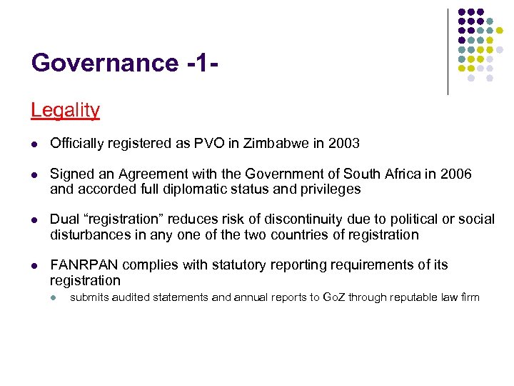 Governance -1 Legality l Officially registered as PVO in Zimbabwe in 2003 l Signed an Agreement with the Government of South Africa in 2006 and accorded full diplomatic status and privileges l Dual “registration” reduces risk of discontinuity due to political or social disturbances in any one of the two countries of registration l FANRPAN complies with statutory reporting requirements of its registration l submits audited statements and annual reports to Go. Z through reputable law firm