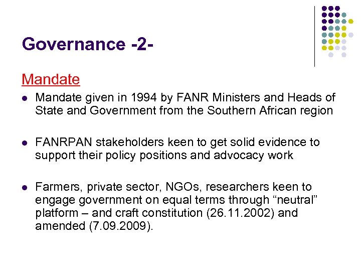Governance -2 Mandate l Mandate given in 1994 by FANR Ministers and Heads of State and Government from the Southern African region l FANRPAN stakeholders keen to get solid evidence to support their policy positions and advocacy work l Farmers, private sector, NGOs, researchers keen to engage government on equal terms through “neutral” platform – and craft constitution (26. 11. 2002) and amended (7. 09. 2009).