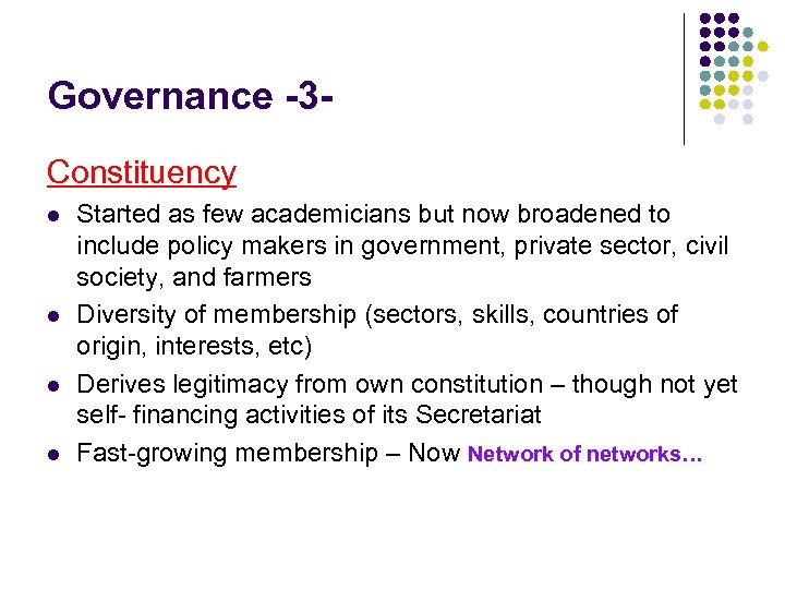 Governance -3 Constituency l l Started as few academicians but now broadened to include policy makers in government, private sector, civil society, and farmers Diversity of membership (sectors, skills, countries of origin, interests, etc) Derives legitimacy from own constitution – though not yet self- financing activities of its Secretariat Fast-growing membership – Now Network of networks…