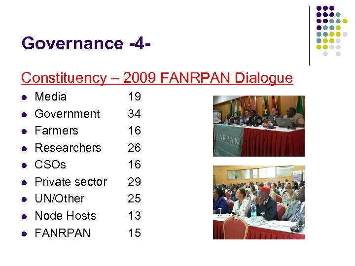 Governance -4 Constituency – 2009 FANRPAN Dialogue l l l l l Media Government Farmers Researchers CSOs Private sector UN/Other Node Hosts FANRPAN 19 34 16 26 16 29 25 13 15
