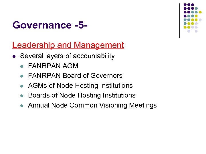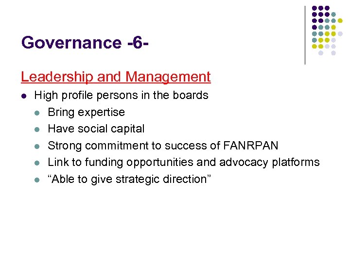 Governance -5 Leadership and Management l Several layers of accountability l FANRPAN AGM l FANRPAN Board of Governors l AGMs of Node Hosting Institutions l Boards of Node Hosting Institutions l Annual Node Common Visioning Meetings