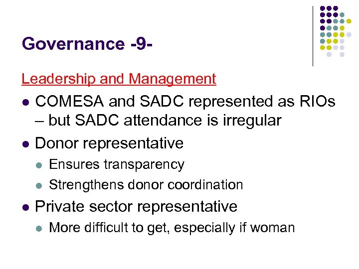 Governance -9 Leadership and Management l l COMESA and SADC represented as RIOs – but SADC attendance is irregular Donor representative l l l Ensures transparency Strengthens donor coordination Private sector representative l More difficult to get, especially if woman