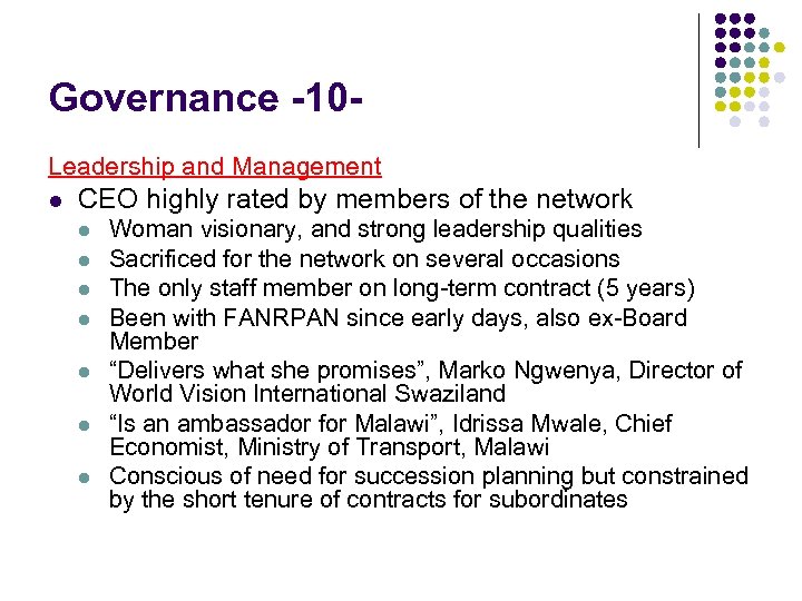 Governance -10 Leadership and Management l CEO highly rated by members of the network l l l l Woman visionary, and strong leadership qualities Sacrificed for the network on several occasions The only staff member on long-term contract (5 years) Been with FANRPAN since early days, also ex-Board Member “Delivers what she promises”, Marko Ngwenya, Director of World Vision International Swaziland “Is an ambassador for Malawi”, Idrissa Mwale, Chief Economist, Ministry of Transport, Malawi Conscious of need for succession planning but constrained by the short tenure of contracts for subordinates