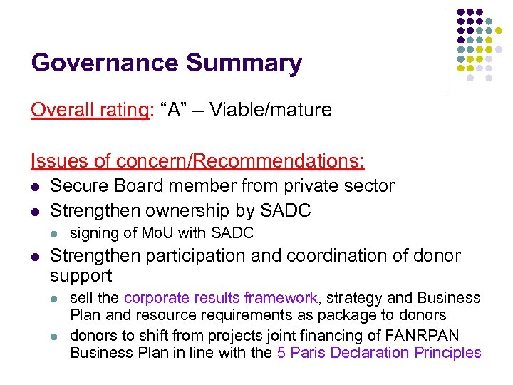 Governance Summary Overall rating: “A” – Viable/mature Issues of concern/Recommendations: l l Secure Board member from private sector Strengthen ownership by SADC l l signing of Mo. U with SADC Strengthen participation and coordination of donor support l l sell the corporate results framework, strategy and Business Plan and resource requirements as package to donors to shift from projects joint financing of FANRPAN Business Plan in line with the 5 Paris Declaration Principles