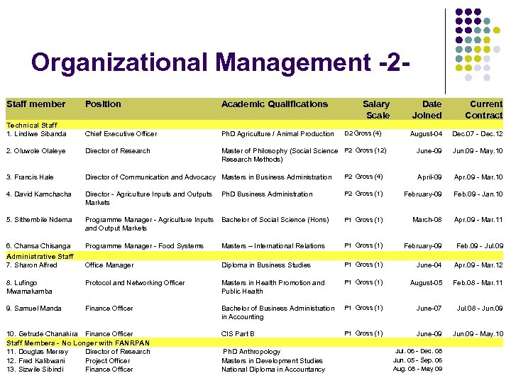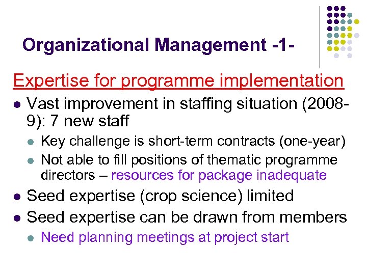 Organizational Management -1 Expertise for programme implementation l Vast improvement in staffing situation (20089): 7 new staff l l Key challenge is short-term contracts (one-year) Not able to fill positions of thematic programme directors – resources for package inadequate Seed expertise (crop science) limited Seed expertise can be drawn from members l Need planning meetings at project start