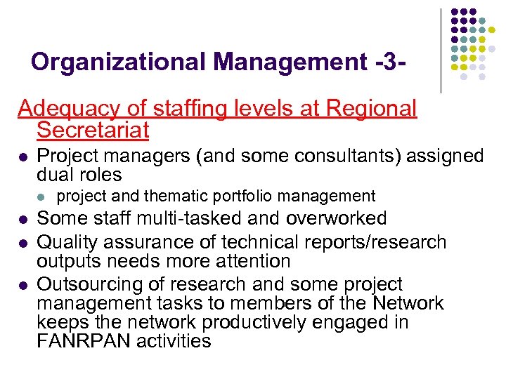 Organizational Management -3 Adequacy of staffing levels at Regional Secretariat l Project managers (and some consultants) assigned dual roles l l project and thematic portfolio management Some staff multi-tasked and overworked Quality assurance of technical reports/research outputs needs more attention Outsourcing of research and some project management tasks to members of the Network keeps the network productively engaged in FANRPAN activities