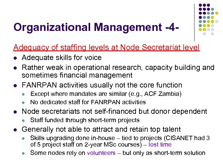 Organizational Management -4 Adequacy of staffing levels at Node Secretariat level l Adequate skills for voice Rather weak in operational research, capacity building and sometimes financial management FANRPAN activities usually not the core function l l l Node secretariats not self-financed but donor dependent l l Except where mandates are similar (e. g. , ACF Zambia) No dedicated staff for FANRPAN activities Staff funded through short-term projects Generally not able to attract and retain top talent l l Skills upgrading done in-house – tied to projects (CISANET had 3 of 5 project staff on 2 -year MSc courses) – lost time Some nodes rely on volunteers – but only as short-term solution