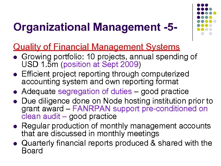 Organizational Management -5 Quality of Financial Management Systems l l l Growing portfolio: 10 projects, annual spending of USD 1. 5 m (position at Sept 2009) Efficient project reporting through computerized accounting system and own reporting format Adequate segregation of duties – good practice Due diligence done on Node hosting institution prior to grant award – FANRPAN support pre-conditioned on clean audit – good practice Regular production of monthly management accounts that are discussed in monthly meetings Quarterly financial reports produced & shared with the Board