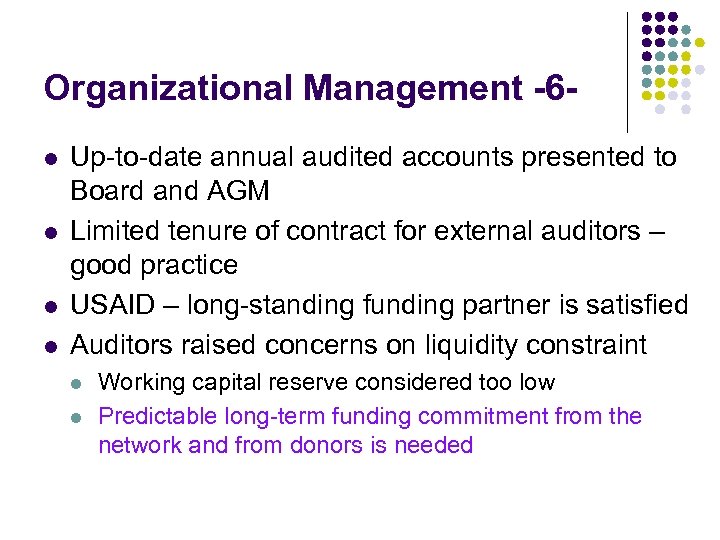 Organizational Management -6 l l Up-to-date annual audited accounts presented to Board and AGM Limited tenure of contract for external auditors – good practice USAID – long-standing funding partner is satisfied Auditors raised concerns on liquidity constraint l l Working capital reserve considered too low Predictable long-term funding commitment from the network and from donors is needed